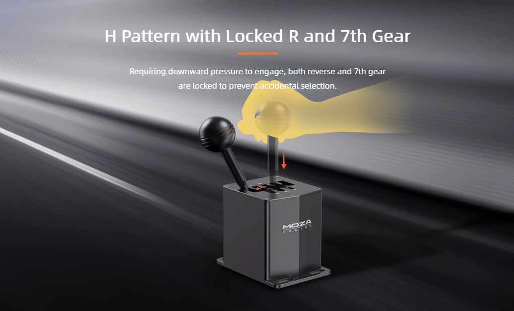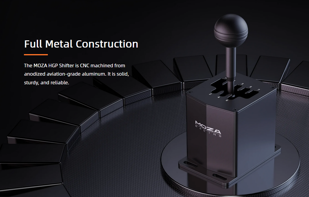 The MOZA HGP Shifter is CNC machined from anodized aviation-grade aluminum. It is solid, sturdy, and reliable. It features seven forward and one reverse gear, meeting the needs of multiple simulation scenarios